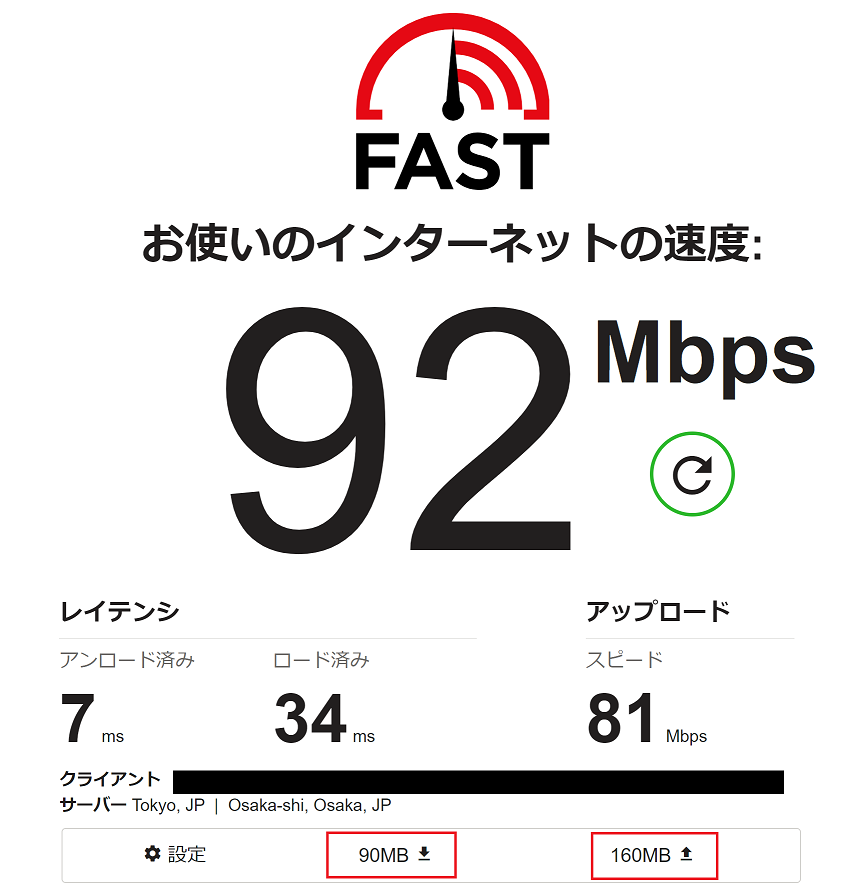 - fast.comでは速度測定結時に使ったデータ転送量がweb上で確認できる(赤枠の部分)